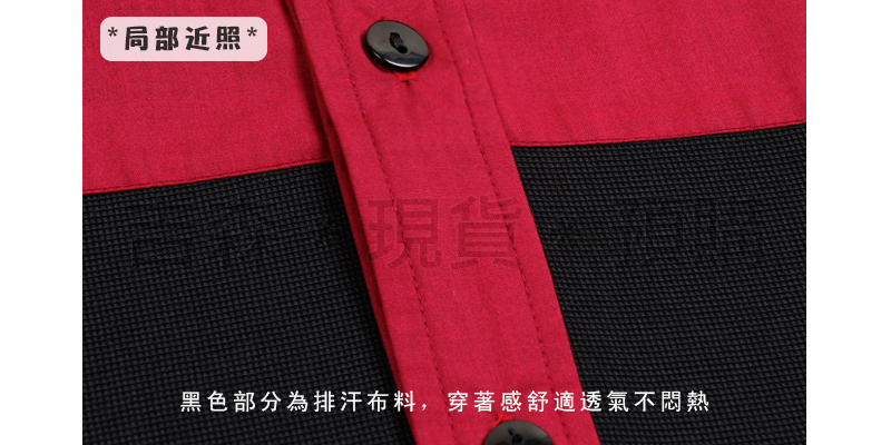 ● 使用棉混紡的平織襯衫布料,剪接吸濕排汗布料,加入胸口、門襟剪接等細節設計,增加襯衫的設